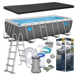 Full zestaw basenowy 15w1 Bestway model #56404 zawiera basen prostokątny na stelażu z całym wyposażeniem.
