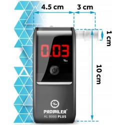 Alkomat elektrochemiczny profesjonalny pomiar Promiler AL 8000 PLUS. Jego główne zalety to duża powtarzalność (możliwość dokonywania pomiarów w małych odstępach czasowych), polecany zarówno dla klientów indywidualnych, jak i właścicieli przedsiębiorstw do okresowej kontroli pracowników. Precyzyjny pomiar, otrzymywane wyniki prezentowane są w zakresie do części setnych promila przy skali pomiarowej do 4,00 ‰.