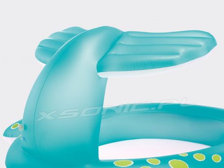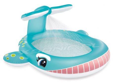 Basen dmuchany wieloryb z fontanną 201 x 196 x 91 cm INTEX 57440. Zbiornik wykonany w kształcie wieloryba w pięknym morskim kolorze. Basen jest duży, a jego wymiary 201 x 196 x 91 cm pomieszczą grupkę bawiących się dzieci. Pod dmuchanym ogonem możemy schronić się przed nadmiernym działaniem słońca. Rozstawiony w ogrodzie lub na tarasie wygląda bardzo atrakcyjnie. Dzieci bawiące się w jego wnętrzu będą zachwycone kolorami i grafiką. Wystarczy kilka godzin na słońcu, a woda będzie nagrzana.