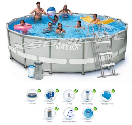 Komplet basen stelażowy Intex model 28310 w zestawie 9w1. Kupując ten produkt otrzymasz basen ogrodowy, pompę, filtr, matę pod basen, przykrycie, dwustronną drabinkę, chemię, skimmer oraz zestaw do czyszczenia kąpieliska. Duży i mocny basen ogrodowy z metalowym stelażem to najlepsza, letnia rozrywka przeznaczona do Twojego ogrodu. Jego konstrukcja została wykonana z tworzywa PVC, które posiada trzy warstwy zabezpieczające zbiornik przed przerwaniem. Baseny wykonane z jasnego tworzywa są mocniejsze od basenów niebieskich.