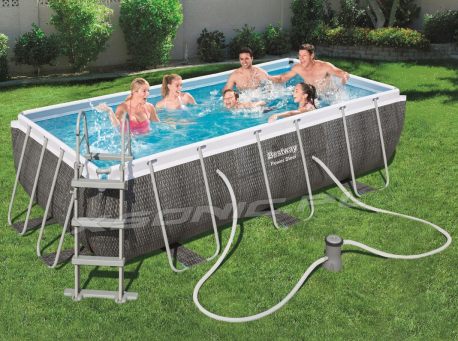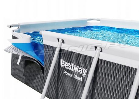 Basen ogrodowy 404 x 201 x 100 cm stelażowy Bestway 56721. Jest to basen ogrodowy w kształcie prostokąta wzmocniony stelażem i nowym kolorze niecki. Basen za domem to bardzo ciekawa propozycja na letnie upały. Wystarczy kilkadziesiąt minut i z pomocą obszernej instrukcji krok po kroku załączonej na płycie DVD w postaci filmu szybko i sprawnie zmontujesz swój basen bez użycia narzędzi. Dla zwiększenia komfortu, w jego zewnętrznej części położono nową mozaikę, która także ucieszy oczy estetów. Basen został perfekcyjnie wykonany. Jak zwykle do dyspozycji użytkowników pozostają zawory ułatwiające odprowadzenie z niego wody i jego oczyszczenie.