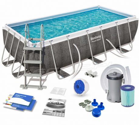 Basen prostokątny Bestway 56721 w zestawie 11w1 z pompą filtrującą, wymiennym filtrem, dozownikiem, dwustronną drabinką, poradnikiem oraz akcesoriami.