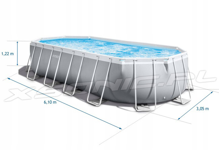 Owalny basen stelażowy 610 x 305 x 122 cm 12w1 INTEX 26798 szary. Jego całkowite wymiary 610 x 305 x 122 cm tworzę ogromne kąpielisko. Osoby aktywne fizyczne ucieszą się z możliwości przeniesienia treningu do ogrodu. Zestaw basenowy 12w1 zawiera najpotrzebniejsze akcesoria do funkcjonowania przydomowego kąpieliska. Przy zakupie takiego zestawu jesteś pewien, że otrzymasz wszystko co potrzebne na rozpoczęcie sezonu kąpielowego. Baseny stelażowe Intex z nowej serii posiadają zmieniony kolor niecki, na inny odcień szarego. Stelaż i konstrukcja zbiornika nie zmieniły się. Metalowy stelaż podtrzymuje każdą ścianę zbiornika z wodą, dlatego basen jest stabilny i nie kołysze się. Tworzy z jakich wykonano nieckę basenu to trójwarstwowe PVC.