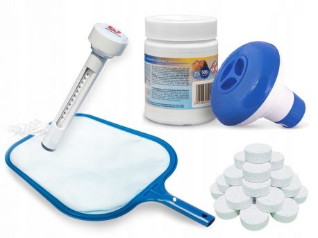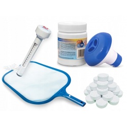 W zestawie znajduje się chemia basenowa jako Multitabletki do rozpuszczania w dozowniku lub w skimerze. Tabletka 20g wystarcza na 2000 litrów wody przez około tydzień. Zestaw 25 tabletek to zapas chemii na cały sezon kąpielowy.