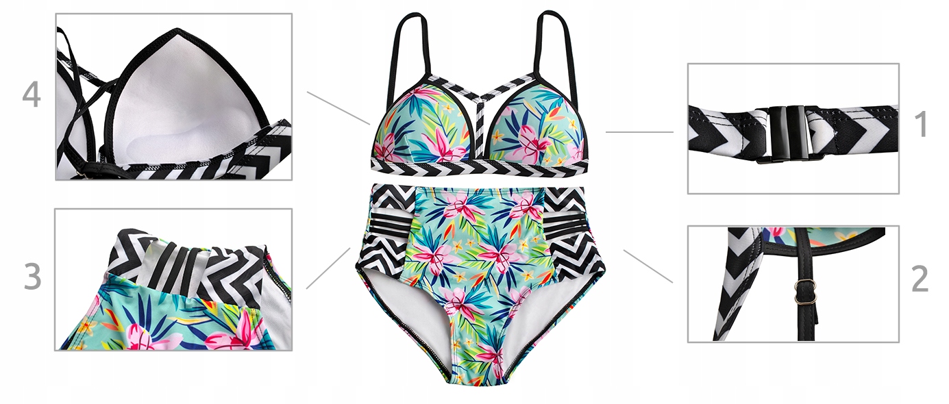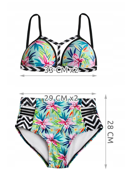 Strój kąpielowy dwuczęściowy Boho z wysokim stanem Push Up. Doskonale podkreśli wcięcie w talii. Majtki kształtują linię bioder i talii, wygładzają je odbierając co najmniej kilka centymetrów w brzuchu. Wysoki stan wydłuża również nogi, a dodatkowe paseczki po bokach dodają całości niesamowitego uroku. Dzięki zastosowaniu aż 82% poliestru strój nie chłonie wody. Posiada właściwości higroskopijnie, nie obciąża nam stroju nasiąkniętą wodą. Natomiast zastosowanie elastanu sprawia, że materiał rozciąga się, po czym wraca do swojego pierwotnego stanu, a dzięki temu doskonale dopasowuje się do ciała. Strój jest elastyczny i nie ogranicza ruchów, dodatkowo jest odporny na działanie olejków do ciała, potu. Nie elektryzuje się oraz nie wywołuje alergii.