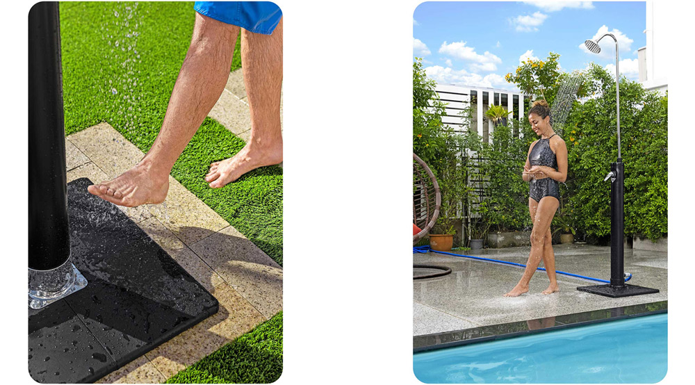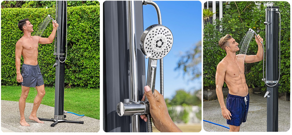 Ciepłą wodę pobiera z rezerwy czyli swojej 35 litrowej obudowy w kolorze czarnym. Zimną wodę dostarcza wąż ogrodowy. Przyda się wszędzie podczas zażywania kąpieli w basenie lub ogrodowym SPA. Albo do schłodzenia ciała w upalne dni. Prysznic może zostać podłączony do węża ogrodowego, dzięki czemu nie musisz przejmować się kończącą się wodą! Rezerwa wody w jego obudowie pomieści aż 35 litrów wody. Czarny kolor szybko nagrzewa wodę poprzez promienie słoneczne. Duża i stabilna podstawa zapewnia bezpieczeństwo i komfort użytkowania prysznica. W prosty sposób dostosuj temperaturę i ciśnienie strumienia wody za pomocą mieszacza. Ruchoma głowica pozwala na regulację wysokości, może być trzymana w dłoni i posiada kilka różnych trybów natrysku! Dodatkowo w tym modelu umieszczono półkę na gąbkę i mydło.