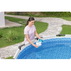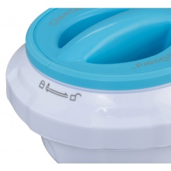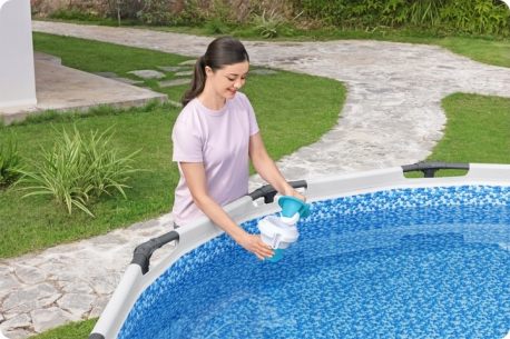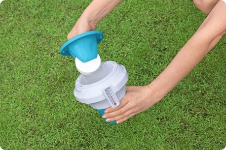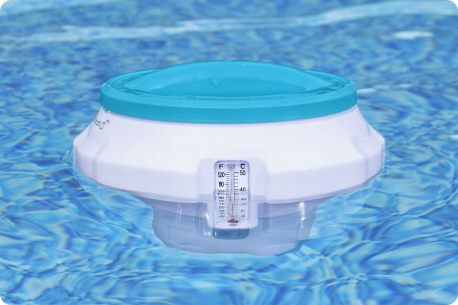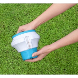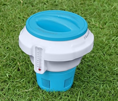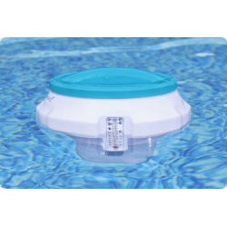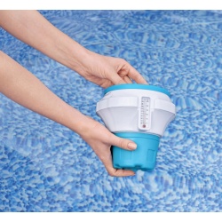 Duży dozownik pływak do chemii basenowej z termometrem Bestway 58701. Pływak posiada regulację intensywności dozowania chemii w postaci wolno rozpuszczających się tabletek. Dozownik dodatkowo posiada wbudowany termometr do sprawdzania temperatury wody w basenie. Jest to nieodzowny element wyposażenia przydomowego kąpieliska. Duże tabletki chemiczne w postaci krążków wkładamy do środka dozownika. Zostawiony w basenie będzie pływał po powierzchni wody powoli rozpuszczając tabletki. Dozowanie przerywamy na czas kąpieli wyjmując dozownik z wody.