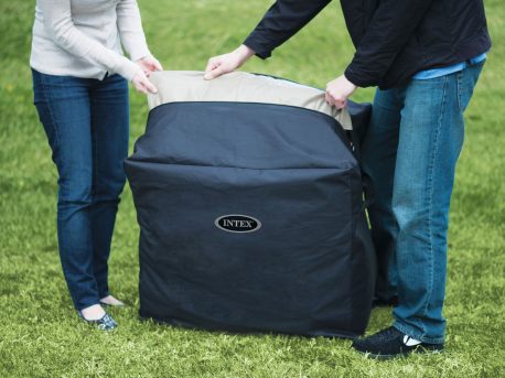 System podgrzewania podnosi temperaturę wody zawsze wtedy, kiedy zaczyna ona spadać. Stopień podgrzania możesz ustawić za pomocą czytelnego panelu sterowania. Basen posiada także elektroniczny system zmiękczania wody. Pokrywa zapinana na klamry doskonale przylega do basenu. To także skuteczne zabezpieczenie przed zabrudzeniami z zewnątrz. SPA jest bardzo stabilne, a to dzięki wykorzystaniu w konstrukcji basenu komór wewnętrznych, które zapewniają trwałość i zabezpieczają przed zdeformowaniem. W zestawie otrzymasz nylonową torbę, która ułatwi ci przechowywanie SPA w trakcie zimy. W basenie mogą przebywać jednocześnie aż 4 osoby, dzięki czemu będziecie mogli się dobrze wspólnie bawić.