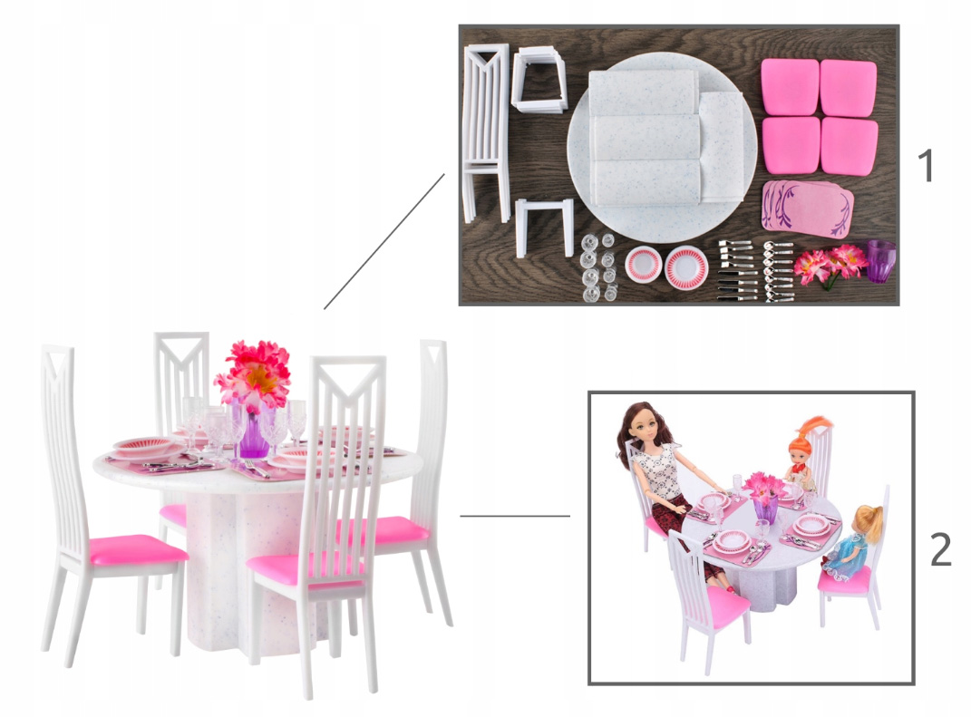 Zestaw mebelków meble dla lalki lalek stół krzesła zastawa 47 elementów. Taka zabawka to marzenie każdej dziewczynki. Z jej pomocą Twoja pociecha z łatwością przeniesie się w krainę wyobraźni i będzie mogło bawić się z siostrą lub koleżankami. Zabawka pozwoli przyjemnie spędzić czas wolny oraz dostarczy mnóstwo radości. Jest to produkt do samodzielnego montażu, który zajmuje zaledwie kilka minut. Dzięki możliwości złożenia dziecko może zabrać mebelki ze sobą do dziadków i kontynuować zabawę. W komplecie znajduje się stół z 4 krzesełkami, 4 podkładki, 4 głębokie oraz 4 płaskie talerze, komplet sztućców (4 noże, 4 widelce, 4 łyżki, 4 łyżeczki), 4 kieliszki do białego wina, 4 kieliszki do czerwonego wina oraz wazon z kwiatkami. Produkt nadaje się doskonale do zabawy indywidualnej oraz w grupie. Pomaga odgrywać dzieciom różne role dorosłych.