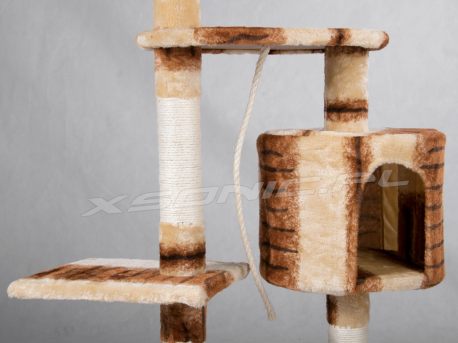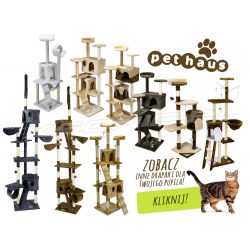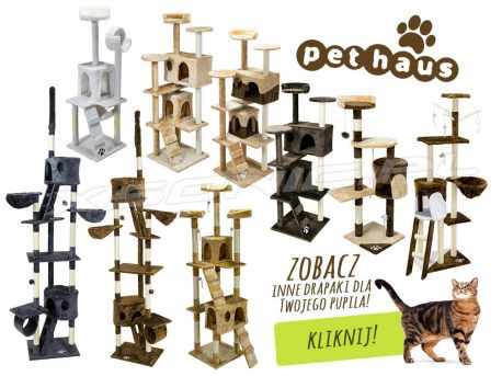 Platformy legowiska Pethous zostały pokryte miękkim pluszem. Ciężka podstawa gwarantuje stabilność drapaka. Słupki pokryte zostały sizalowym sznurem odpornym na kocie pazury. Kot do dyspozycji ma trzy platformy do siedzenia i leżenia na różnej wysokości, przytulny domek w którym może się schować i czekać na swoją ofiarę, gruby sznur do gryzienia i drapania oraz kulkę na sprężynce do łapania.