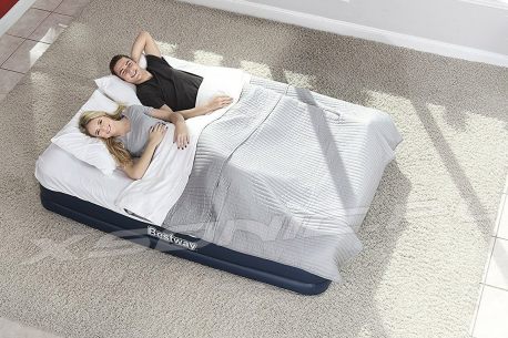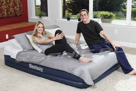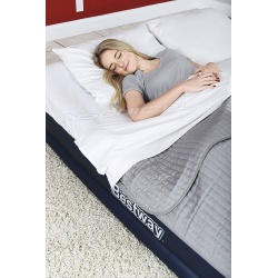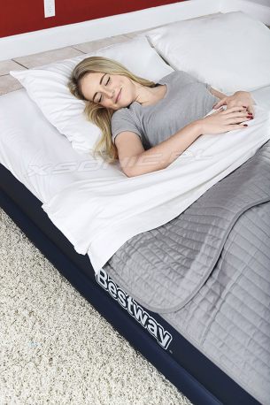 Jeśli nie posiadasz klasycznego łóżka możesz się zaopatrzyć w elegancki materac welurowy Bestway. Stabilna, wygodna, powietrzna konstrukcja coil-beam zapewnia wysoki komfort spania. Stonowana kolorystyka szaro-granatowa pasuje do każdego pomieszczenia. Jest to idealne łóżko dmuchane dla gości i do użytku codziennego. Wymiary 203 x 152 x 43 cm zapewniają dużo miejsca do wypoczynku dla dwóch osób. Został wykonany ze sprawdzonego tworzywa PVC zapewniającego wytrzymałość. Flokowana powierzchnia jest miła w dotyku i zapewnia stałe położenie prześcieradła. Łatwo się ją czyści wilgotną gąbką lub ściereczką.