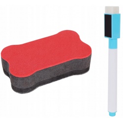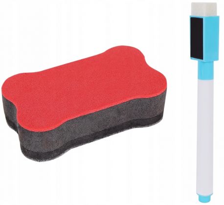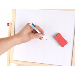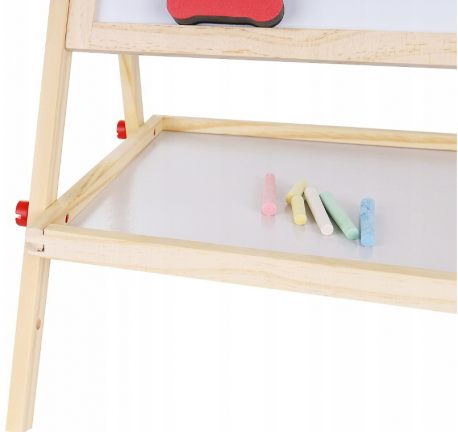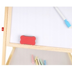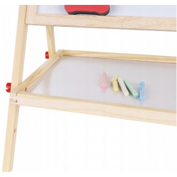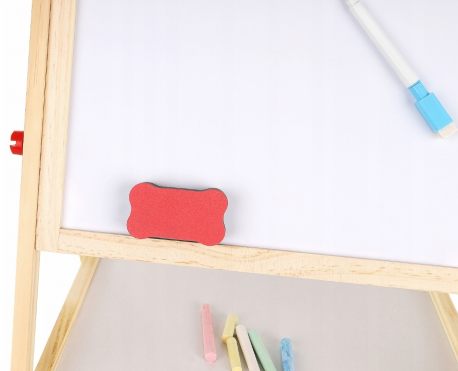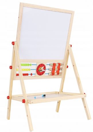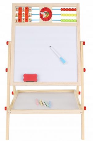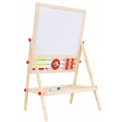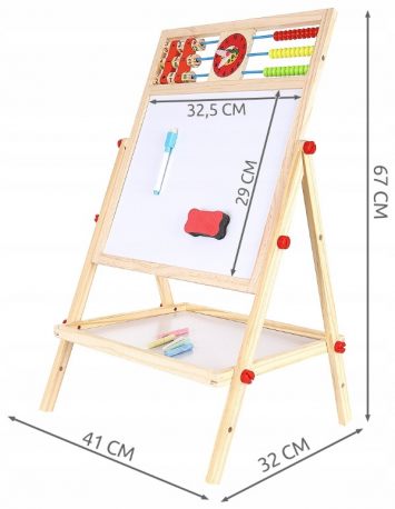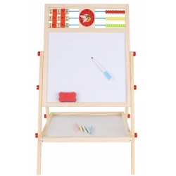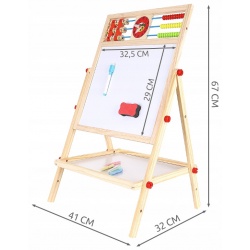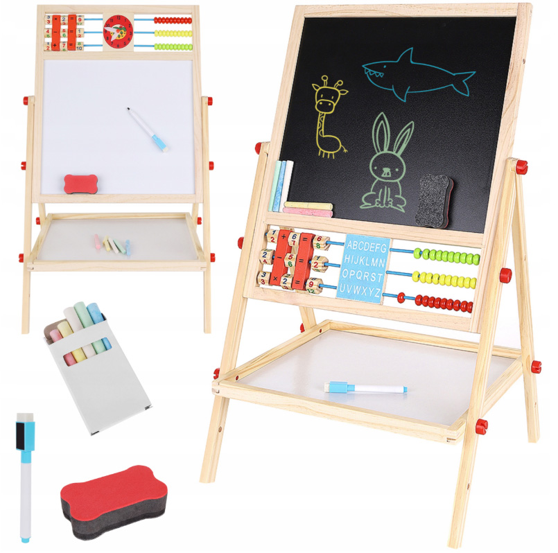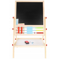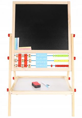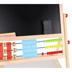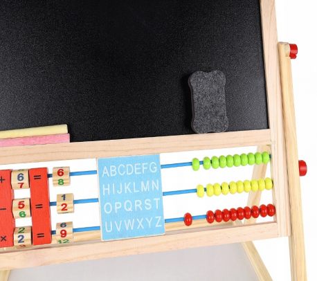 Dwustronna tablica edukacyjna wyposażona w kredę, pisak, gąbkę, liczydło, alfabet i półkę.