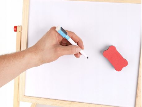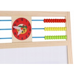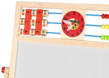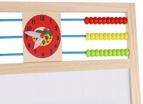 1 TABLICA aż 6 FUNKCJI - tablica dwustronna to aż 6 różnych zastosowań. Umożliwia dziecku malowanie kredą po czarnej stronie tablicy oraz malowanie mazakiem po białej stronie. Tablica posiada także klasyczne liczydło z koralikami, z którym dziecko zacznie przygodę z liczeniem. Następnie może uczyć się podstawowych działań matematycznych, takich jak dodawanie, odejmowanie oraz mnożenie. Dziecko będzie miało również do czynienia z zegarem, na którym będzie mogło dowolnie ustawić czas za pomocą wskazówek. Na tablicy znajduje się również alfabet, który pozwoli dziecku zapoznać się z pierwszymi literami, co pozwoli później na tworzenie pierwszych wyrazów.