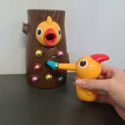Gra zręcznościowa dla dzieci Dzięcioł i robaczki. Gra jest bardzo wciągająca i zapewnia świetną zabawę na długi czas. Pomoże rozwinąć zdolności manualne dziecka i nauczy je refleksu. Ta wyjątkowa gra to doskonały pomysł na zajęcie malucha. Zabawa polega na chwytaniu magnetycznym ptaszkiem robaczków ukrytych w dziurkach znajdujących się w pniu, a następnie karmieniu pisklaka znajdującego się w dziupli. Dziubek ptaszka jest zakończony magnesem, a robaczki metalem. Dzięcioł z łatwością wyciąga więc robaczki z dziurek i karmi swoje pisklę. Jest to spore wyzwanie dla malucha, które wymaga skupienia uwagi oraz sprawności manualnej.