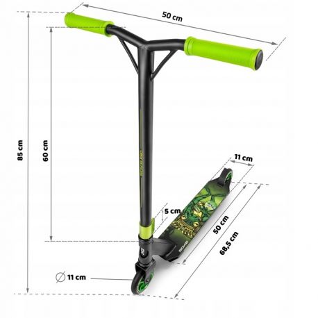 Idealnie wyważona do tricków. Wysokość 60 cm do jazdy wyczynowej. Zamontowane gripy z gumy TPR specjalnie wybranej do hulajnóg wyczynowych znacząco poprawiają chwyt.