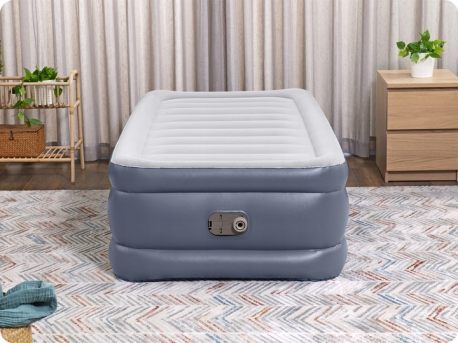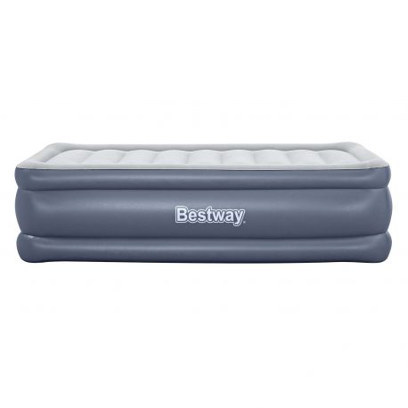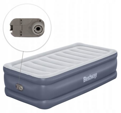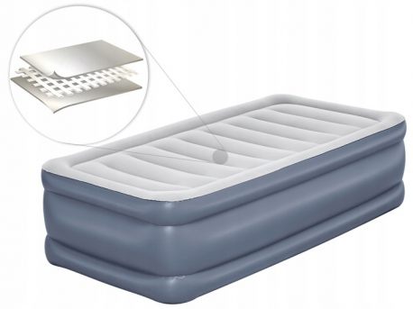Materac dmuchany łóżko 191 x 97 x 51 cm Bestway 6713G. Za stabilność materaca odpowiada jego wewnętrzny stelaż. W materacach Bestway wykorzystano zaawansowaną technologię I-beam, opartą na łączeniu dolnej i górnej powierzchni materaca poziomymi pasami. Takie dmuchane łóżko znajdzie zastosowanie w każdym domu. Możesz z niego korzystać jak z normalnego posłania lub awaryjnie w przypadku odwiedzin gości. Dzięki szarej kolorystyce dmuchane łóżko rozstawione w salonie lub w sypialni na pewno nie zakłóci harmonii ani wystroju mieszkania. Duży komfort spania, wytrzymała konstrukcja i wykończenie w postaci miękkiego weluru to nie jedyne jego zalety. Materac posiada wbudowaną pompkę elektryczną w jedną ze ścian. Po podłączeniu do zasilania sieciowego 220V napompuje się sam w ciągu 180 sekund. W komplecie również łatka naprawcza.