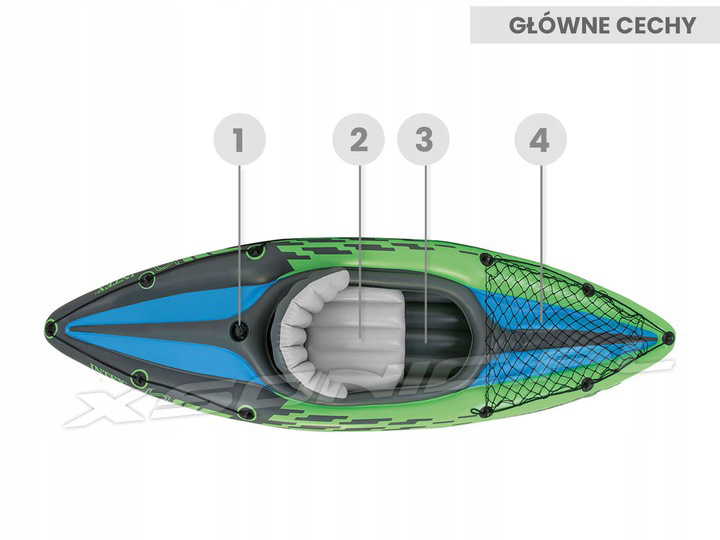 1. Zawór bostoński2. Siedzisko dmuchane3. Miękkie, dmuchane dno pontonu z technologią I-beam4. Siatka na bagaż |
