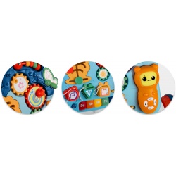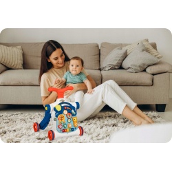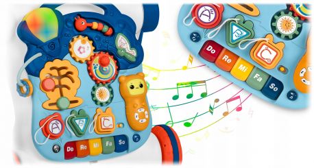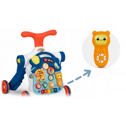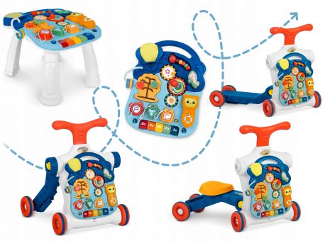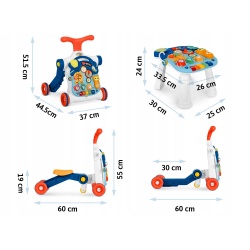 Interaktywny chodzik pchacz dla malucha organki klawisze melodie dźwięki. Jeździk, pchacz, hulajnoga, stolik i tablica edukacyjna to idealna zabawka dla maluchów uczących się chodzić i raczkujących, które stawiają swoje pierwsze kroki. Posiada elementy grające i świecące, które można całkowicie wyłączyć, jak też w płynnie regulować ich głośność. Oprócz nauki chodzenia, produkt idealnie nadaje się do nauki liczb, kolorów i kształtów. Wyjmowany panel (aby wyjąć panel, należy nacisnąć przycisk znajdujący się z dołu konstrukcji, aby zwolnić zaczep) może być używany jako tablica edukacyjna, a po dodaniu do niego nóżek w szybki sposób zmienia się w stolik edukacyjny.