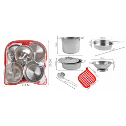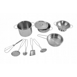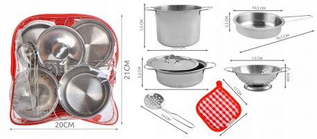 Zestaw garnków dla dzieci metalowe naczynia garnki zabawa w gotowanie. W komplecie znalazły się 2 garnki, patelnia, durszlak, pokrywka (pasuje do każdego garnka), komplet różnego rodzaju łyżek, plecaczek oraz materiałowa podkładka wraz z rękawiczką. Zestaw srebrnych garnków umożliwia interesującą zabawę w dom, bar, restaurację. Srebrny, klasyczny kolor będzie pasował do każdej kuchni, a maluch poczuje się jak prawdziwy szef kuchni. Metalowe naczynia i sztućce to zabawka, która rozwija wyobraźnię i pobudza kreatywność, a także uczy współpracy w grupie i usprawnia zdolności społeczno-integracyjne. Zestaw znakomicie nadaje się do samodzielnej zabawy oraz z dorosłymi lub z innymi dziećmi.