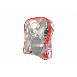 13 ELEMENTÓW - w zestawie znajduje się 13 elementów, czyli wszystko co jest potrzebne dla małego kucharza: 2 garnki, patelnia, durszlak, pokrywka (pasuje do każdego garnka), komplet różnego rodzaju łyżek, plecaczek oraz materiałowa podkładka wraz z rękawiczką.