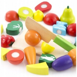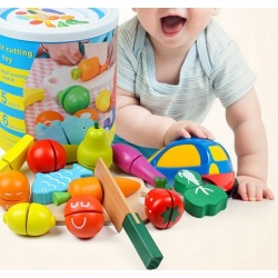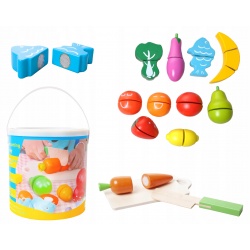 Warzywa do krojenia drewniane w wiaderku na rzepy drewniany nóż deska. Zestaw kolorowych warzyw i owoców ww wiaderku jest doskonały do zabawy w market, robienie zakupów zakupy i gotowanie. Dzieci lubią podpatrywać dorosłych, a gotowanie z rodzicami jest również dla nich świetnym zajęciem. Rzepy wewnątrz artykułów umożliwiają ponowne łączenie dwóch przekrojonych połówek w całość, co niewątpliwie jest przydatną funkcją i urozmaica zabawę. Zabawki zostały wykonane precyzyjnie, a ich żywe i soczyste kolory wpływają na walory estetyczne. Nożyk oraz reszta przedmiotów mają łagodnie wykończone krawędzie, są zatem bezpieczne w użytkowaniu.