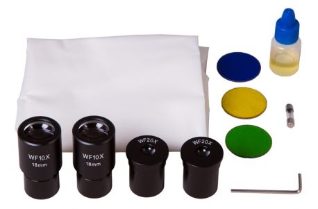 Zestaw zawiera wysokiej jakości obiektywy achromatyczne i buteleczkę z olejkiem imersyjnym. Mikroskop jest również wyposażony w dwie pary wymiennych okularów: okular Huygensa i okular o szerokim polu widzenia. Bogaty zestaw akcesoriów umożliwia wybór optymalnego powiększenia i pola widzenia w celu obserwacji określonych preparatów mikroskopowych. Pełna skala powiększania tego mikroskopu wynosi od 40x do 2000x. Oświetlenie LED o regulowanym poziomie jasności zostało zamontowane pod stolikiem. Mikroskop został również wyposażony we wbudowany kondensor Abbego z diafragmą irysową, który ogranicza straty światła i umożliwia dokładne skupienie wiązki światła na obserwowanym preparacie. Centrowanie umożliwiają specjalne śruby. Ostrość może być regulowana za pomocą jednego pokrętła; system ustawiania ostrości zawiera skale regulacji zgrubnej i precyzyjnej.