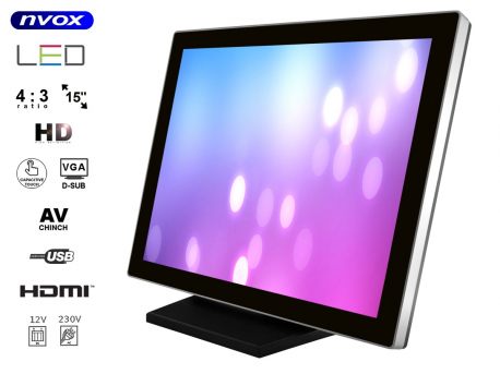 Monitor z dotykowy LED 15 cali HD VGA HDMI USB 12V 230V. Monitor wyposażony został w ekran o przekątnej 15 cali, rozdzielczości matrycy wynosi 1024 x 768 pikseli. Do podłączenia monitora z komputerem PC służy wbudowane złącze VGA oraz dodatkowo złącze HDMI. Wejście sygnału wideo w standardzie AV pozwala na podłączenie dodatkowego urządzenia. Monitor posiada wbudowano na jego tylnej obudowie mocowanie do uchwytu w standardzie VESA umożliwiające powieszenie monitora na ścianie lub innym elemencie. Monitor może być zasilany z gniazda sieciowego lub gniazda zapalniczki samochodowej 12V (opcja) przez co może być wykorzystany w dowolnym celu.