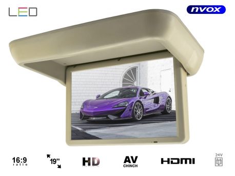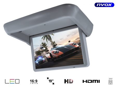 Monitor podwieszany z matrycą LED o przekątnej 19 cali, posiada automatycznie otwierany i zamykany panel za pośrednictwem wbudowanego mechanizmu elektrycznego. Monitor dedykowany jest do autobusu, autokaru, busa i tira wszędzie tam gdzie dostępne jest zasilanie 24V. Monitor posiada wejście HDMI co pozwala oglądać ulubione filmy z komputera, nowoczesnego tunera DVB-T lub odtwarzacza DVD. Oprócz tego ten samochodowy monitor posiada wejście AV-in czyli standardowe złącze RCA. Automatycznie zamykany ekran nie jest narażony na uszkodzenia.