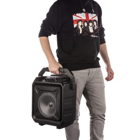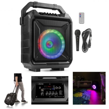 Kolumna mobilna na kółkach 8'' MOVE80 LED BT akumulator Fenton. Sprzęt jest łatwy w obsłudze i bezproblemowy w transporcie. A jeszcze dodatkowo posiadający wiele opcji kontrolowania dźwięku czy to z kolumny, czy z mikrofonów. Górny panel kolumny udostępnia użytkownikowi pokrętła do regulacji oraz przyciski funkcyjne. Jeśli nie chce Ci się wstawać z fotele lub stoisz za daleko możesz sterować za pomocą dołączonego, bezprzewodowego pilota. Mobilne nagłośnienie sprawdzi się praktycznie w każdym miejscu, zarówno komercyjnym jak i w przydomowym ogrodzie do karaoke. Wbudowany kolorowy dyskotekowy pierścień LED w głośniku dodaje wyjątkowego spektakularnego i zapierającego dech w piersiach pokazu świetlnego na każdej imprezie. MOVE80 to samodzielny, zasilany akumulatorowe zestaw nagłaśniający z wbudowanym światłem LED wokół głośników.