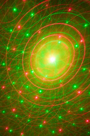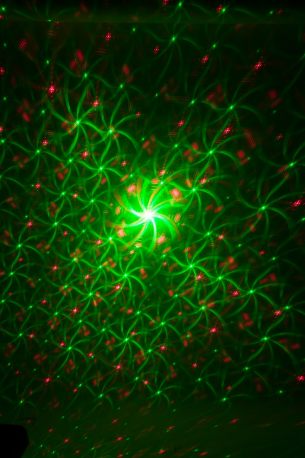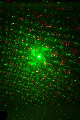 Kompaktowy, domowy laser o czerwonym i zielonym kolorze wiązek.