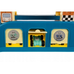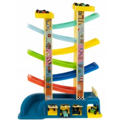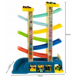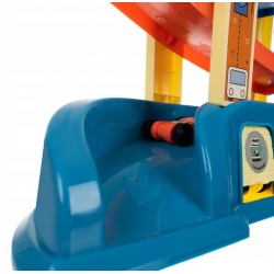DUŻY TOR DLA AUT – zjeżdżalnia dla autek posiada 6 poziomów w różnych kolorach, na których mogą ścigać się autka. Podczas zabawy dziecko będzie mieć możliwość obserwacji zjeżdżających samochodów oraz ich niezwykłej prędkości. Do zestawu oprócz autek dołączone zostały także 3 garaże.
