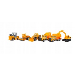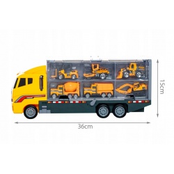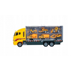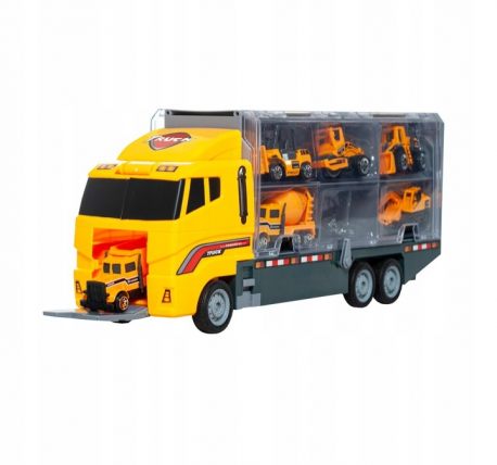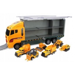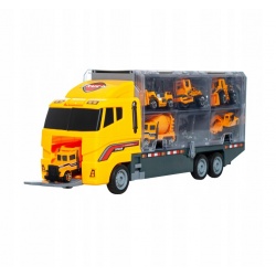 CIĘŻARÓWKA + POJAZDY BUDOWLANE - zestaw składa się z tira, oraz 6 maszyn budowlanych. Posiada funkcję rozkładania, dzięki której bez problemu można wyjąć samochodziki z lawety. Zabawka wykonana została bardzo dokładnie, odwzorowując wszystkie szczegóły. Wygląda realistycznie, czym zachęca malucha do zabawy.
