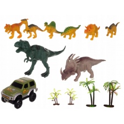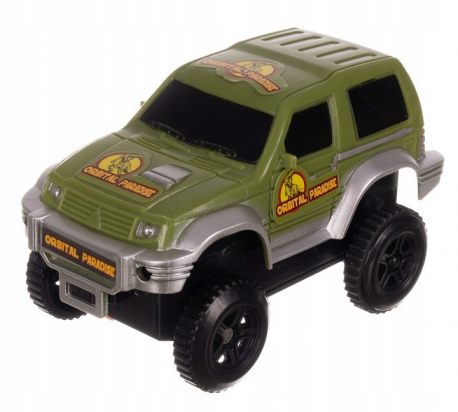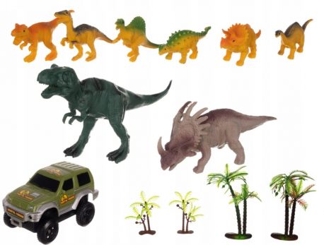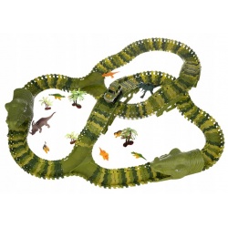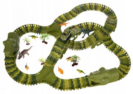 DO ZBUDOWANIA - w zestawie znajdują się 240 elementów toru 31 części parku. Zestaw posiada 2 tunele w kształcie głowy dinozaura (4 elementy), 4 palmy, 8 podpór toru (most), 4 mocowania mostu, 2 zwrotnice torowe, 8 figurek różnych dinozaurów oraz samochodzik terenowy. Samochodzik zasilany jest baterią, dzięki czemu z dużą prędkością porusza się po torze, a jego przyczepność jest na tyle mocna, że nie wypadnie z toru! Cały tor wykonano w klimacie dżungli, więc Twoja pociecha poczuje się jak w prawdziwym parku dinozaurów.