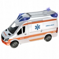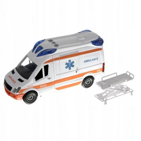 Ambulans karetka pogotowia auto dźwięki pogotowie światło. Po włączeniu przycisku na dachu karetka włączą się wydając dźwięk ostrzegawczy oraz świecąc się na niebiesko. Nosze po wyjęciu z karetki można podnieść do góry, odwzorowuje to prawdziwe nosze z ambulansu. Samochód posiada napęd na przednie koła więc karetka sama jeździ.