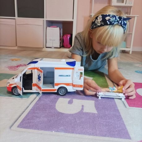 OTWIERANE DRZWI – zabawka posiada otwierane drzwi. Drzwi kierowcy, pasażera, boczne oraz tył karetki jest otwierany wystarczy pociągnąć.