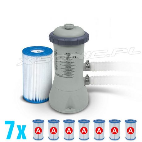Pompa filtrująca i 7 filtrów typu A w zestawie przeznaczona do basenów ogrodowych i stelażowych.