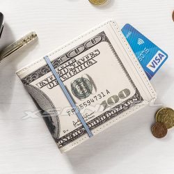 - wygodny portfel z motywem pliku 100 dolarówek przewiązany gumką