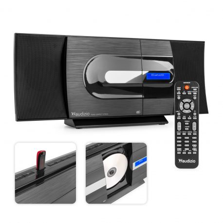 Miniwieża stereofoniczna Tours Audizio BT CD DAB+ FM radio USB pilot. Stereofoniczny zestaw HiFi Tours to kompaktowe, stylowe urządzenie z niezliczonymi opcjami odtwarzania, niezależnie od tego, czy szukasz muzyki z ulubionych płyt CD, albumów MP3, czy najnowszych wiadomości z cyfrowych stacji DAB+ lub lokalnych stacji radiowych FM. Smukły odtwarzacz CD jest zintegrowany z pionowo stojącym lub wiszącym panelem przednim, dzięki czemu cały system ma tylko 10cm głębokości. Miniwieża bez problemu rozpoznaje pliki MP3 i odtwarza je w dobrej jakości. Aby dostosować jakość dźwięku do indywidualnych upodobań, Audizio oferuje dodatkową funkcję X-Bass, która podkreśla basy oraz funkcję korektora z domyślnymi ustawieniami Classic, Pop, Jazz i Rock. Poprzez wejście AUX, wieżę można łatwo podłączyć do urządzenia zewnętrznego, takiego jak domowy komputer PC, smartfon, tablet lub laptop.