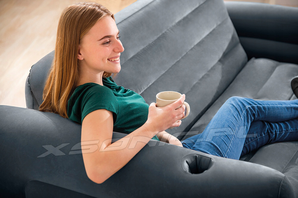 Dmuchana sofa rozkładane łóżko 2w1 z oparciem fotel INTEX 66552. Wygodne siedzenie o wymiarach 224 x 203 x 66 cm przeznaczony do użytku dwuosobowego. Uniwersalny produkt posiadający funkcję sofy oraz łóżka. Dzięki takiej możliwości, wykorzystanie tego produktu będzie zależało od Państwa potrzeb. Pierwsza opcja to wygodna sofa z oparciem i podłokietnikami, lecz gdy potrzebne jest dodatkowe spanie to wystarczy rozłożyć siedzenie aby uzyskać dwuosobowe dmuchane łóżko. Sofa wykonana została z wytrzymałego tworzywa PCV, lecz w przypadku awarii, zestaw zawiera łatkę naprawczą. Wysokie podparcie i mocne podłokietniki zostały zaprojektowane, tak aby wygodnie się siedziało, bez bólu pleców. Jest to wygodna kanapa i przestronne łóżko w rozmiarze Queen. Sprawdzi się jako sofa w trakcie przyjęcia i jako łóżko, gdyby goście chcieli zostać na noc. Doskonała na maraton filmowy i męskie granie na konsoli!