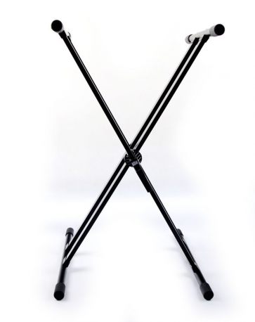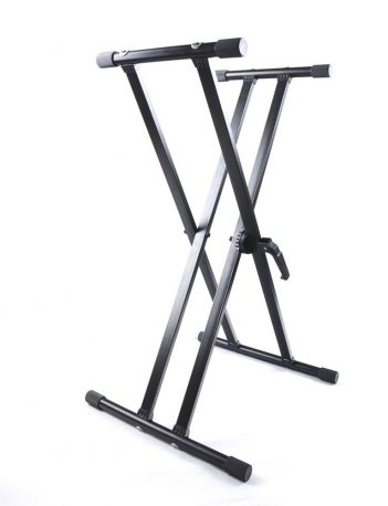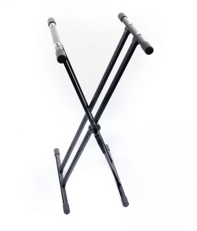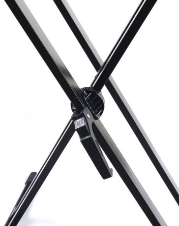 Podwójny statyw pod keyboard bardzo stabilny dla profesjonalnych muzyków. Wykonany został z materiałów najwyższej jakości. Posiada pierścieniowy mechanizm, który został podwójnie wzmocniony. Poprzeczki na instrument są gumowane, dzięki czemu mamy pewność, że urządzenie się nie zsunie. Maksymalny udźwig statywu to 75 kg, więc utrzyma nawet bardzo ciężki sprzęt, a przy tym zachowa stabilność. Statyw został tak skonstruowany, by zapewnić jak najwyższy komfort użytkowania. Specjalny mechanizm zatrzaskowy pozwala na płynną regulację rozstawu statywu w bardzo szerokim zakresie. Zatrzaśnięcie pierścienia sterującego spowoduje blokadę w danej pozycji.