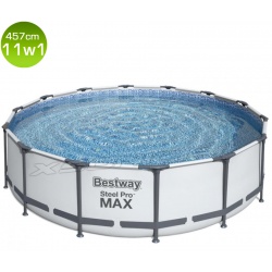 Zestaw kąpielowy 11w1 z potrzebnymi akcesoriami i dużym basenem Bestway Steel Max Pro o wymiarach 457 x 107 cm w kolorze szarym.