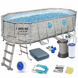 Prezentujemy duży, owalny basen stelażowy Power Steel 549 x 274 x 122 cm z pompą i filtrem w kolorze szarym.