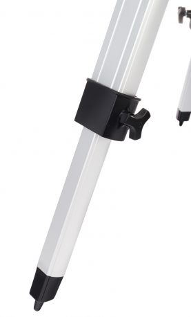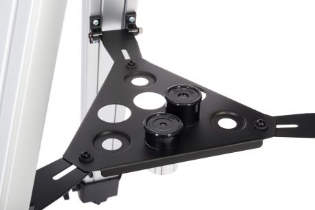 Statyw jest wykonany z aluminium. Na środku jest półka narzędziowa, a nogi mają regulowaną wysokość.