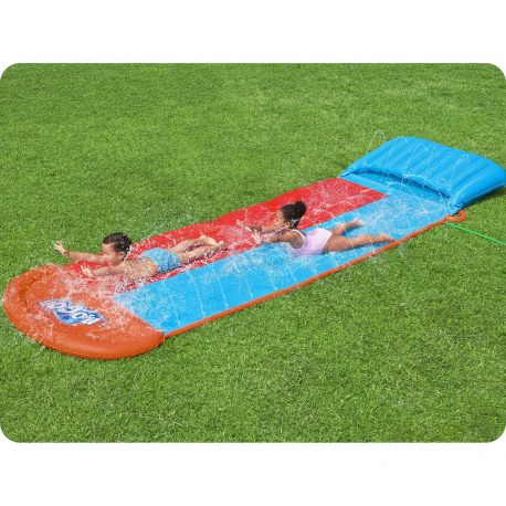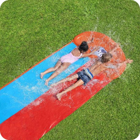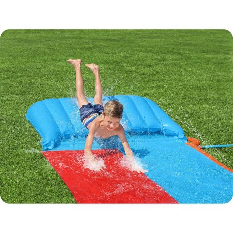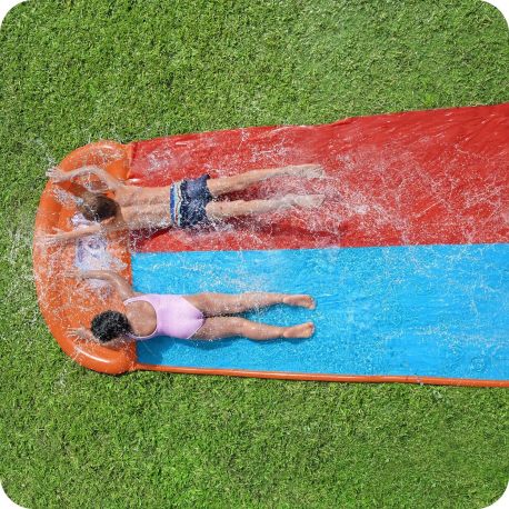Ślizgawka jest dwuosobowa i posiada dwa tory, które są nawodnione przez fontanny znajdujące się na całej długości ślizgawki. Wygrywa maluch, który pierwszy dotrze do dmuchanej mety! Ten model posiada dmuchany start, czyli podniesioną do góry platformę startową. To zapewnia użytkownikowi lepszy ślizg bez konieczności brania rozpędu. Ślizgawka posiada zabezpieczenia, które pozwalają przytwierdzić ją do podłoża, tak aby nie przesuwała się podczas ślizgania się. Podłączana jest do węża ogrodowego przez standardowe złącze. Długość całkowita tej dwuosobowej ślizgawki wynosi 488cm. Teraz nuda w ogrodzie już nikomu nie grozi, a wodna ślizgawka będzie miejscem do letniej ochłody.