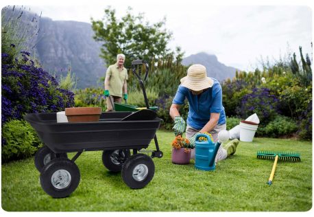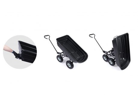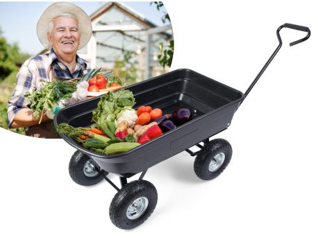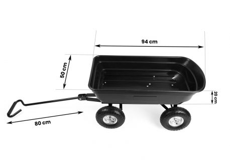 Wózek ogrodowy, wywrotka na pompowanych kołach i uchwytem do ciągnięcia. Jej pojemność wynosi 75 litrów.