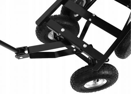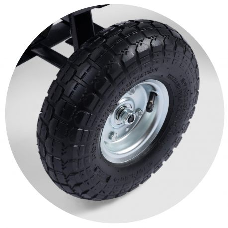 WYTRZYMAŁY - wózek doskonale radzi sobie z obciążeniem aż do 300kg. Posiada 4 koła pneumatyczne, które amortyzują wstrząsy, a dodatkowo łatwiej oraz płynniej się je prowadzi. Pompowane koła łatwiej poradzą sobie z podjazdem na krawężnik, schodki itp. Ciśnienie w oponach można regulować zmniejszając lub zwiększając ilość powietrza. Pozwoli to na dużą elastyczność oraz dopasowanie do podłoża. Felgi wykonane zostały ze stali ocynkowanej, dzięki czemu są one odporne na korozję i będą zachowane w idealnym stanie.