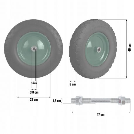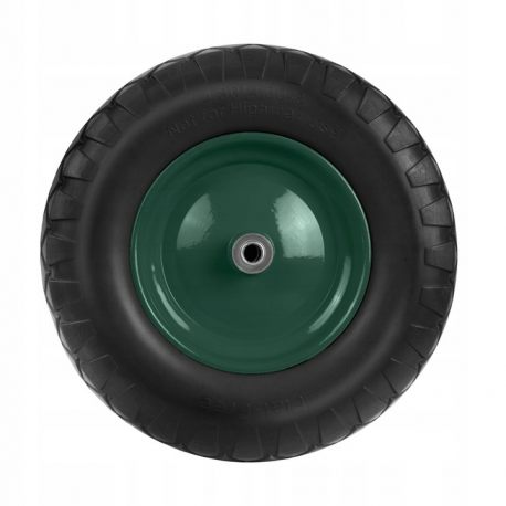 Koło do taczki wózka przyczepki bezdętkowe PU 4.80 - 4.00-8 zielone. Bezdętkowe koło do taczki z bieżnikiem i ośką w zestawie, a w środku pełne. Koło z poliuretanu ugina się, amortyzuje i pracuje tak, jakby było pneumatyczne. Nie musisz się obawiać o przebicie opony tak jak w dotychczasowych kołach. Jest to szczególnie istotne na placu budowy, gdzie łatwo można trafić na gwóźdź, pręt lub jakąś śrubę. Jest równie wydajne jak koła pompowane, a jednocześnie bardziej od nich wytrzymałe.