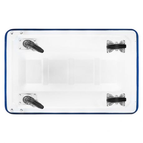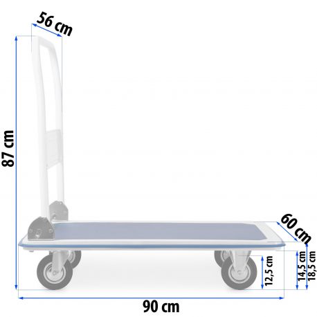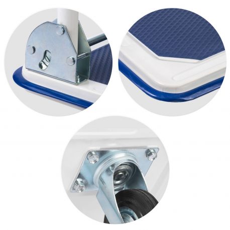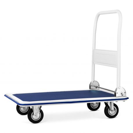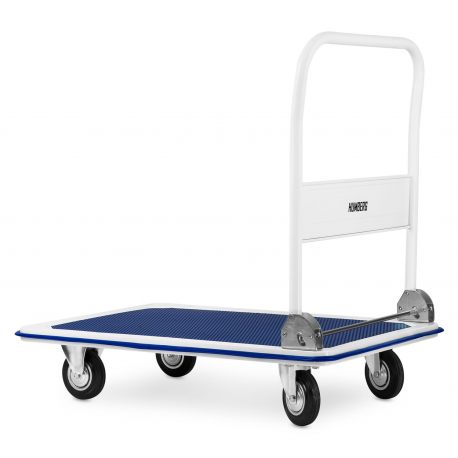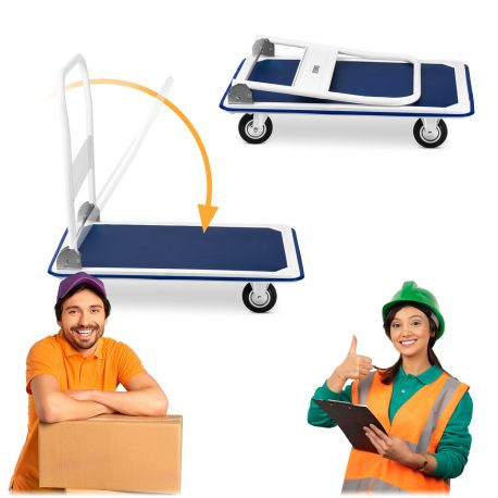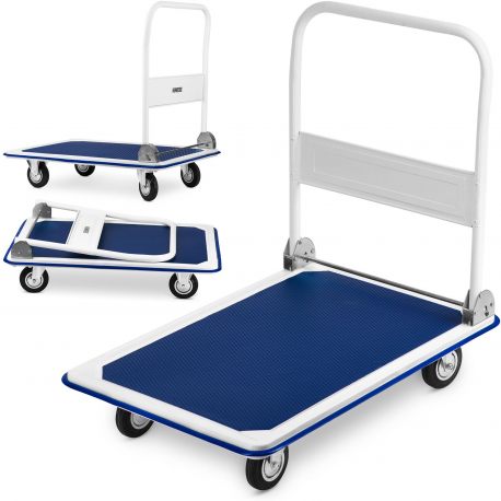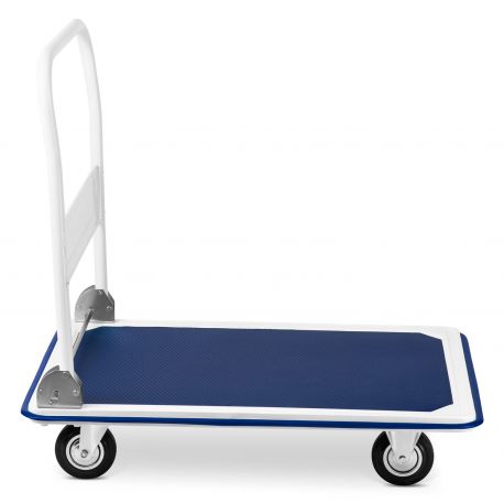 Wózek platformowy transportowy do 300 kg ze składaną rączką magazynowy. Manewrowanie ułatwia poręczna, składana rączka oraz dwa koła stałe i dwa obracane. Skrętne kółka pozwalają na bardzo precyzyjne kierowanie wózkiem. Powłoka platformy jest antypoślizgowa, a krawędź wózka zabezpieczona amortyzującą gumą. Dzięki niej nie ma obawy o uszkodzenia towarów ani ścian podczas transportowania. Oparcie zabezpiecza przed zsunięciem się towaru na nogi podczas przewożenia. Wózek posiada składany uchwyt dzięki czemu nie zajmuje wiele miejsca w magazynie. Składanie odbywa się za pomocą półautomatycznej technologii naciągu sprężynowego, po naciśnięciu ramy blokującej.