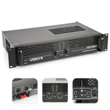 Profesjonalny wzmacniacz PA stereo 2x 750W VXA-1500 Vonyx. Wykorzystujący bardziej stabilny obwód z technologią SMT, zapewniający wysoką moc wyjściową. Z niskim poziomem hałasu i szerokim pasmem przenoszenia. Doskonały stosunek jakości do ceny. Nadaje się do systemów rack 19". Idealny do użytku w dyskotekach, barach, klubach, na scenie itp.